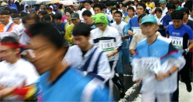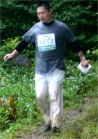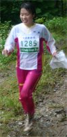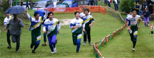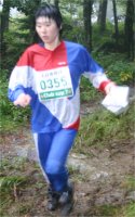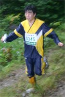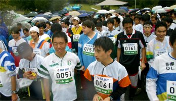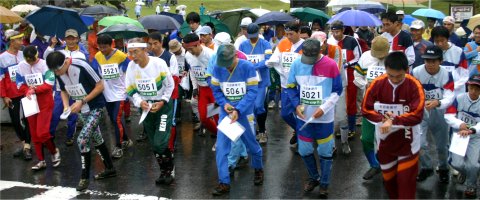 雨の中行われた クラブカップ2004 第1走者のスタート。 気迫に満ちた怒涛が 駒ヶ根高原の森に 吸い込まれていきます。 |
