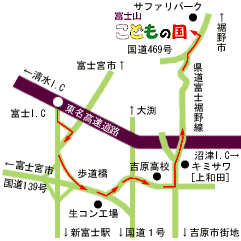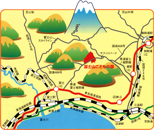 It is 30 minutes from "Susono IC (Toumei-Highway)" on the prefecture road 24 and the national highway 469 to the Fuji direction. It is 40 minutes from "Fuji IC (Toumei-Highway)" on the prefecture road 24 and the national highway 469 to the Susono City direction. Mount Fuji Children's World Parking place (1400cars Free) |