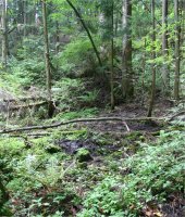 | 駒ヶ根高原の緩斜面にある緩やかな沢 | 微地形地帯を 調査する山川氏 |