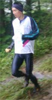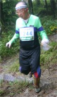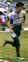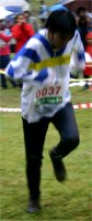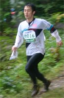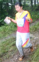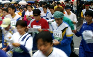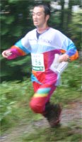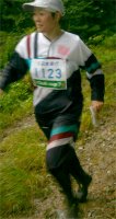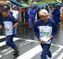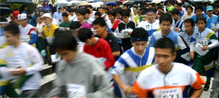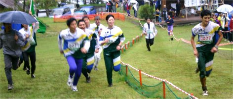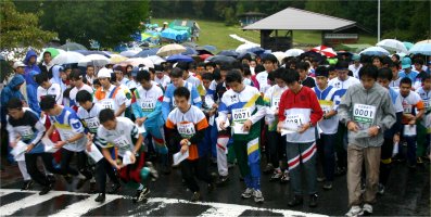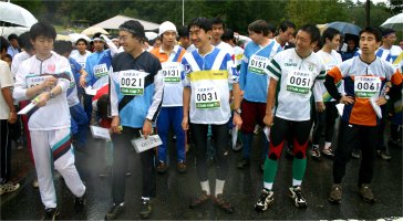 雨の中行われた クラブカップ2004 第1走者のスタート。 気迫に満ちた怒涛が 駒ヶ根高原の森に 吸い込まれていきます。 |