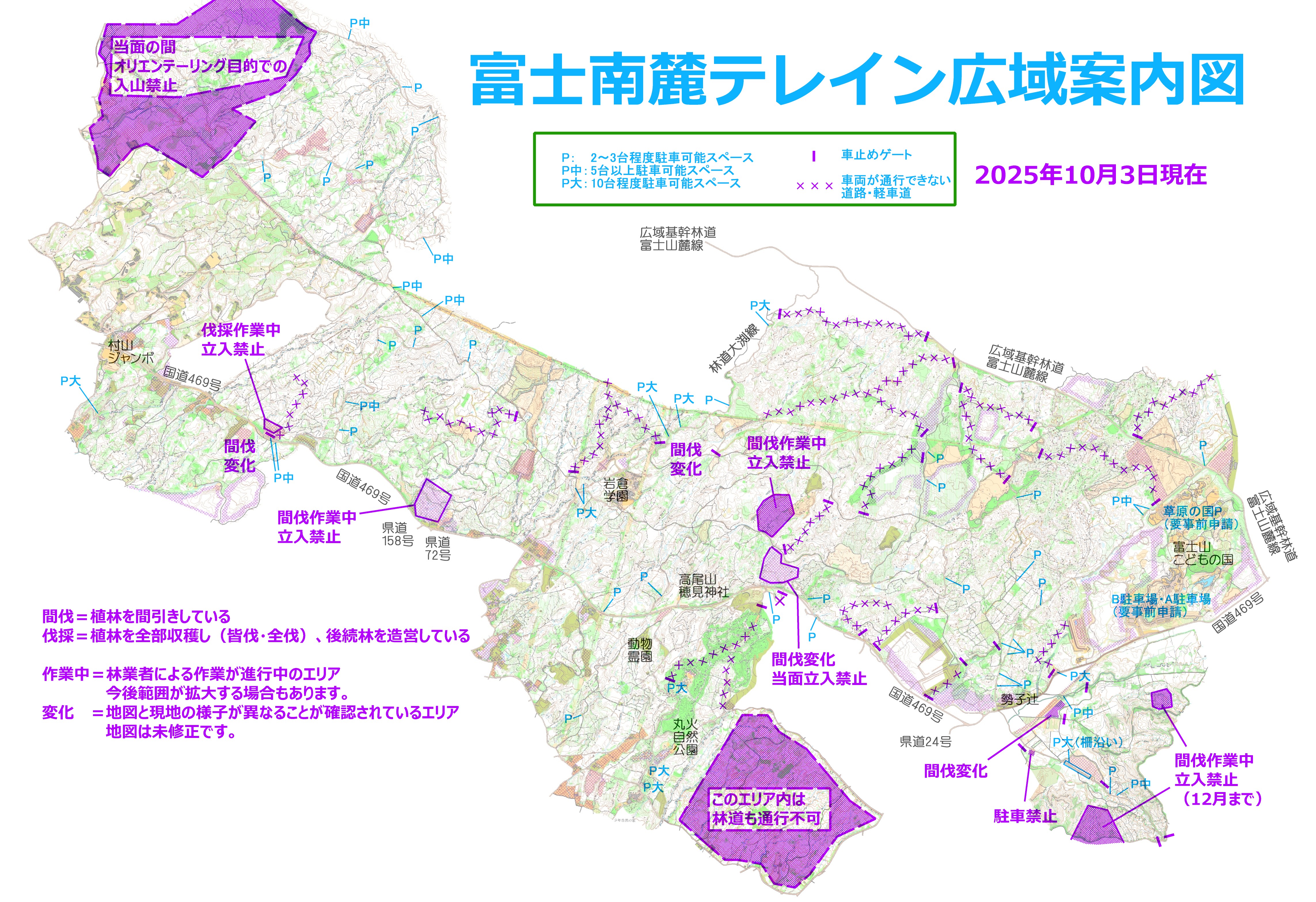 オープン(地図販売している)のテレインについては、原則オリエンテーリングの活動はできますが、販売時に担当者より、追加の注意喚起などの案内がある場合がありますので、必ず指示に従って下さい。また、テレイン内で林業作業をされている箇所には絶対に近づかないで下さい。ご利用の際には、各自で最新の気象情報・交通情報をご確認願います。