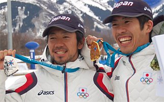 | 男子15kmフリー 表彰式 (拡大写真) 1位 吉田(日本) 2位 成瀬(日本) 3位 シェボッコ(カザフスタン) | 銀メダルの成瀬選手と金メダルの吉田選手 (拡大写真) |