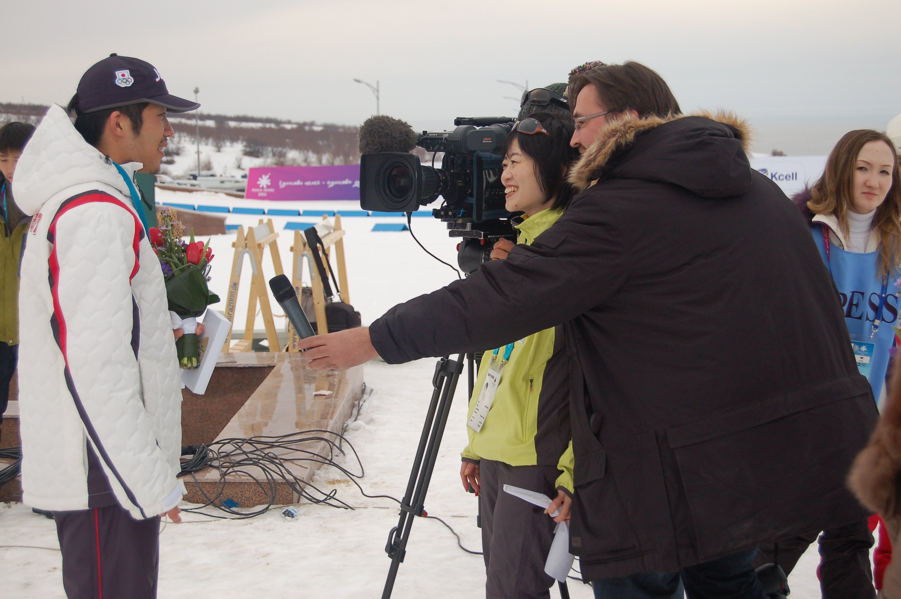 | オーストリアのメディア取材に応じる吉田選手 (拡大写真) | こちらもメディア取材に応じる成瀬選手(拡大写真) |