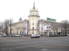 | こちらはアルマティ市のダウンタウン この建物がスーパーマーケット | アルマティ市の公園 夜のモニュメント前にて | 大会マスコットの レオイリビ君もライトアップ |