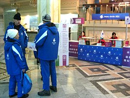 | 競技のある日は まだ暗いうちから会場入り | スタジアムに雪が降っています。 アサイチで軍用犬が会場をパトロール | 役員ホテルとなったOTRAR(オトラール) 旧ソ連時代からの古いホテル。 たぶん当時は最高級ホテル | モデルイベントの日は明るくなってから役員出動。 朝の気温は-10℃くらい。 |