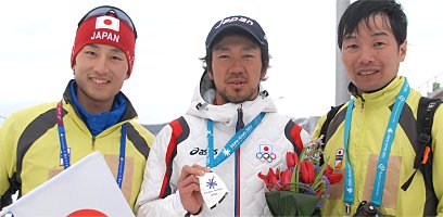 | 銀メダルの成瀬野生選手と | クロスカントリースキー 銀メダルの成瀬野生選手を囲んで 堀江守弘(左) 成瀬野生(中央) 木村佳司(右)。 | メダルを運ぶ前の役員と記念撮影 |