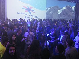 | 打ち上げのあと、運営者の若者はディスコ。 アジア冬季大会運営者慰労のために開かれた ー夜限りの「 Mountain Disco」 | もちろん大会役員は無料招待状 こういった運営ケアも含めてこの大会は素晴らしい。 まさにカザフスタン国民挙げてのお祭り | 会場にはアジア冬季大会のロゴと スポーツシーンが巨大スクリーンで スキーオリエンテーリングはすべて競技終了 |