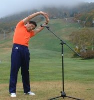 NHKラジオ体操の長野信一さん 後ろは斑尾山の紅葉 |