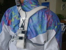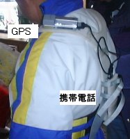 背中に携帯電話とGPSを装着し