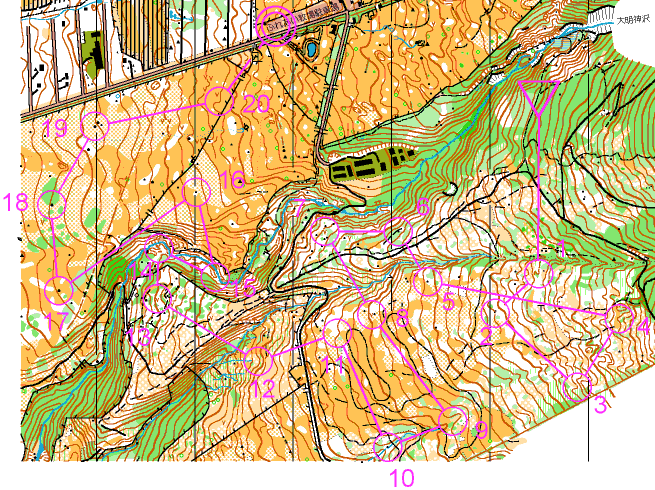 「菅平アゲイン」の名の通り、インカレショート2002併設のMALコースを基本に設定しました。今回はインカレの時と違って、学生選手権コースの制約を受けないので、もっと自由に組むことができました。 序盤は細かな地形をコントロールピッキング感覚で回ってもらっています。ダウンヒルを基調としたスピードの出る設定になっています。 インカレショート2002の時はもっと南側までコースを広げていたのですが、今回は牧場の都合もあって、中盤はすぐに「中尾根」と呼ばれる場所に入ります。ここから後半はほぼインカレショート2002の時のコースと同じになっています。一部翌日のロゲイン大会のコントロールに近くなりそうだったので、取りやめたコントロールもあります。 皆さんがスタートし終わった後で、運営者もこのコースを走りました。かなりがんばって走ったつもりですが、トップの松澤君に遅れること20分。こうしてみると松澤君の叩き出した32分台というタイムはとてつもない怪物タイムだったなと思えてきます。 |