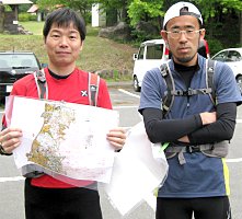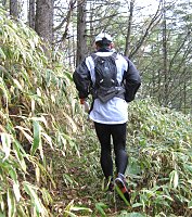 | 本日の試走は 長野県オリエンテーリング協会の2名。 木村佳司(左)と丸山(右) | 標高1773mの池山山頂を目指して 新緑のトンネルを駆け上がります。 本日はゆっくりと行きます。 | 登山ルートにいくつか水場があります。 トイレも多くあります。 |