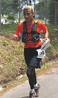 | 森を進む上條。 村越・田島組とルート戦略は ほぼ同じ | 混合2位の尾崎・笠原組 尾根を登ってきます。 | 斜面を駆け下る 田島 | 杉山(男子シニア賞) 競技範囲の南端近く |