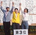 ■三浦千鶴 「コメントを書くことだけが仕事、という困った役職でございます。なのに、「団長、団長」と呼んでいただいて(呼びやがって、とも言う。)誠に恐縮でございます。 しかし、それをきっかけに「手ぬぐい」が企まれ、選手団というまとまりを感じることができ、でっかい応援につながったことは大変喜ばしい。これまでと比べて良い成績ってのもすばらしい。 でも、最後の「もっといける!」という雰囲気が、今回の最大の収穫だったと思います。みなさまの今後のご活躍を期待いたしております。・・・が、「団長!」はホントに、すごい恥ずかしいんだってば。」 3バカ感想