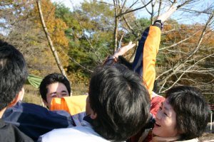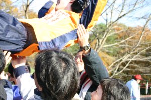 | 続いてカントクの胴上げ | 地面に落とされた カントク |
