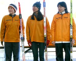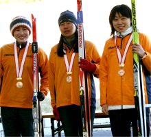 | 女子の表彰式にはユニフォームと なぜかスキーで望んだ長野チーム |