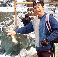 牛伏寺のトレードマーク 「牛くん」を撫ぜる市川 |