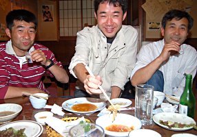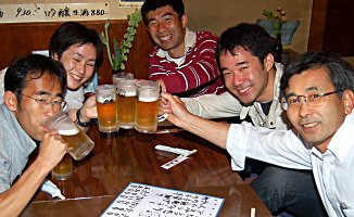 木村です。 長野県協会総会およびその他一連の行事に参加された皆さんおつかれさまでした。 長野からは近場の2日間ですが、結果的に2日間とは思えないほど盛りだくさんの内容でした。まずは2日間のイベントをざっとレビュー 5月19日(土) (1)恐竜 公園JOG 大降りの雨も止み、晴れ間が見える爽やかな雰囲気。10:00頃に恐竜公園(篠ノ井)の駐車場に集合。周囲は保育園の遠足児童でいっぱい。 恐竜公園のO-mapと不動島のO-mapを持って試走を始める。不動島のコースを外れて、茶臼山へ。風林火山の旗が立つ信玄の本陣から森に入ってすぐの 山頂へ。地図の一番端までいった時点からさらにジョギングでテレイン外へ。そのまま川中島カントリークラブの入口まで往復。 帰りは不動島の試走コースに復帰して、フラッグが置けそうかどうか点検。合計1時間30分ほど軽ぅ〜く走った。あらら、雷の音がしてきたぞ。 (木村・美和・加々美・立花・金田・黒田・丸山) (2)恐竜 ラーメン屋 恐竜公園直下のラーメン屋に入ったとたん、突然の稲妻と土砂降り。あの園児たちや父兄たちにとって忘れられない遠足になっただろう。我々がラーメン屋から でるころにはすっかり青空が戻っていた。 (木村・美和・加々美・立花・金田・黒田・丸山) (3)お見 合いの湯 近くの中尾山温泉に汗を流しに行く。どうやら「お見合いの湯」なるものがあるらしい。なんじゃそりゃ? 露天風呂の男湯と女湯の間仕切りに鳥居がある。女湯側から紐を引くと鳥居の中にあるスクリーン窓が開いて顔をあわせることができる。 女湯側からこんな紐を操作する人いるの?と思っていたら、なななんと、若い女の集団がキャーキャー言いながら面白がって窓を開いている。同じグループの若 い男の集団も大コーフンではしゃいでいる。 山裾のひなびた温泉のはずだったが、若い男女の興奮と絶叫の声があたりにこだましていた。うーんすごい温泉だ。 (木村・美和・加々美・金田・黒田) (4)マイ ナス一次会? まだ15時だというのに長野中心地のホテルにチェックイン。 県協会総会までまだ時間がずいぶんあるので、さっそく長野の街に繰り出す。まだ営業している飲み屋を探すが、さすがに無い。 しかし探せばあるもので、昼間からビール。季節の長野の名物をガンガンと食べる。蜂の子、馬鹿刺、根曲竹、山菜・・・「渓流」のどぶろくがすげー旨い。 (木村・美和・加々美・黒田・丸山) (5)長野 県協会総会 ホテルのエグゼクティブルームという最上階の部屋に多くのメンバーを迎えて、18:30より総会開始。こちらの詳細は別途。 我々が宴会をしている間に、総会資料も出来あがっていた。 (木村・鳥川・美和・加々美・立花・金田・黒田・丸山・美谷島・山崎・元木悟) (6)懇親 一次会? 20:00から長野県内では超有名な歓楽街「権堂」に繰り出す。 結局・路地の飲み屋に落ち着いてカンパイ。ここでも「どぶろく」が大人気。 (木村・鳥川・美和・加々美・立花・金田・黒田・丸山・美谷島) (7)カラ オケ 地元の美谷島さんは夜の長野へと消えてゆきました。まだ元気なモノは一気にカラオケへ。普段は見せないアスリートたちの別の別の一面が見えたのが収穫だっ たかな。 結局15:50から深夜1:30まで、総会の2時間を除いて私たちはナニをやっていたのでしょうか? (木村・加々美・立花・金田・黒田) 5月20日(日) (1)上越 市OLC大会 晴れていた長野駅で友佳くんを拾って、雨の上越市に移動。 ふったり止んだりの天候の中、謙信春日山城のテレインに向かってスタート。滑るテレイン状況だったのでピン付きシューズがとっても役に立った。 「今日のコースは割りとカンタンかな?」と思っていら、どうしてどうして。なかなかフラッグが見つからない。 本日のサプライズコントロールはMAクラスの4番。設置位置にサプライズがあったが、競技者同士が協力しあって何とかフラッグを見つけた。この件に関して は長野の小林君が大金星をあげたといえるだろう。 濡れた新緑の中を走って、かなり痒い感じ。暑くなかったので、快適に走れた。ワンダーランドを彷徨う感覚を堪能した。 結局MAとWAでは主催者が不成立を宣言。賞品の新潟米はジャンケン大会に託されることになった。そんな米も結局いつもの元木友子が勝ち取ってしまう。 今回は残念ながら不成立クラスが出たが、毎年この地域で競技会を開催することが重要。上越市OLCは来年もめげずにやってくれると思う。運営おつかれさま でした。 (木村・美和・黒田・友佳・小林・元木悟・元木友) (2)富蔵 そば 帰りに秘蔵のソバを食べようということで車を連ねてでかける。新潟県と長野県の県境に近い場所。こんな山奥に民家があるのかというほどの山奥にある食堂。 大盛のざるそばをみんなでいただく。 富蔵集落には共同浴場があり、ここに入る。オリエンテーリングでカブレそうになっていたので、やっと一安心。 レポート:木村佳司 |