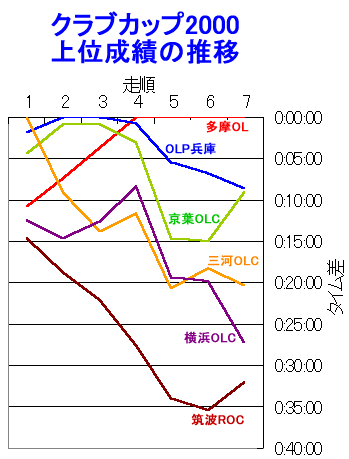なおこれは正式な成績ではありません。 トータスの石澤君の記録データを元に、多摩OLの菅原君、木村が手を加えたデータをグラフにしたものです。 このグラフはクラブカップに最終的に6位までに入ったチームの中だけで計算してあります。 |