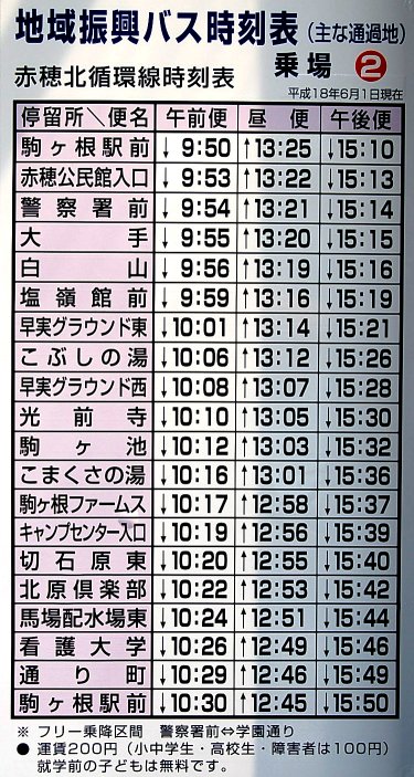 駒ヶ根駅前 09:50 こぶしの湯 10:06 駒ヶ根駅前 10:30 駒ヶ根駅前 12:45 こぶしの湯 13:12 駒ヶ根駅前 13:25 駒ヶ根駅前 15:10 こぶしの湯 15:26 駒ヶ根駅前 15:50 (2006年6月1日現在) |