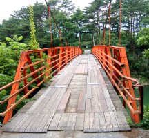 かかる赤い橋。小型車が通れる 吊橋です。スリリング〜〜。 |