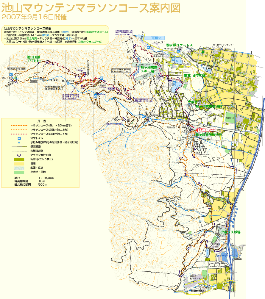 | 2007年9月15日(土) オリエンテーリング大会 (スプリント競技) 会場:駒ヶ 根ファームス 2007 年9月16日(日) 池山マウンテンマラソン大会 会場:駒ヶ 根高原家族旅行村 (プランナー:石川弘樹) ![]() 池山マウンテンマラソンコース図 オリエンテーリング大 会 会場:駒ヶ 根高原家族旅行村 トレイルオリ エンテーリング競技成績 2007 年9月17日(祝) クラブカップリレー オリエンテーリング大会 会場:駒ヶ 根市アルプス球場 クラブカップ成績 ベテランカップ成績 クラブカップ走順成績 クラブカップコース順成績 大会プログラム(9月10日掲載) 大会全体について (1044kB) 9月15日のプログラム (1271KB) 9月16日のプログラム (1567KB) 9月17日のプログラム (1643KB) 昨 年までの成績(873KB) 上記全体を一括ファイルで (2934KB) クラブカップ走区概要 クラブカップ掲示板 イベントレポート 2007年9月16日 池山マウンテンマラソン 2007年9月15日 スプリント競技 事前・周辺レポート 2007年9月05日・12月01日 駒ヶ根竜東トレイル調査 2007年9月19日 中央アルプストレイルラン調査隊 2007年7月28日 高鳥谷山マウンテンマラソン計画の試走 2007年7月8日 クラブカップ試 走編 2007年7月7日 池山マウンテン マラソン試走 2007年6月17日 スプリントテレ イン紹介 2007年6月17日 池山調査GPS 編 2007年6月3日 GPS調査 開始 過去のクラブカップ