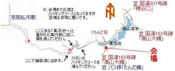 - 京阪交野線私市駅から徒歩約60分。徒歩にて来られる場合は下図を参照してください。非常に道がわかりにくいですが、万一指定されたルートを外れてしまった場合、失格になることもあります。出来るだけ、道のわかる人と来るようにしてください。また、京阪私市駅から徒歩で来られる方は、必ず10:30までに会場に到着するようにして下さい。