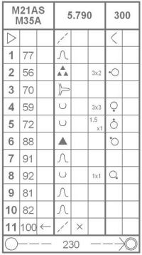 | M21AS M35A 距離:5790m 登り:300m スタート:小道 曲がり 1(77) 沢 2(56) 岩石地 3X2m 西側 3(70) 尾根 4(59) 小凹地 3x3m 南側 5(72) 小凹地 1.5x1m 北側 6(88) 石 北西側 7(91) 沢 8(92) 小凹地 1x1m 南東側 9(81) 沢 10(82) 沢 11(100) 西の小道の分岐 ゴール:テープ誘導 230m |