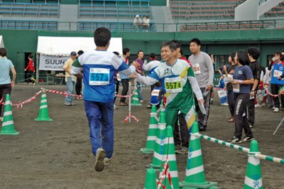 ![]() Eチーム1走宇野明子さんから2走鈴木規弘さんへのチェンジオーバー。<上林様提供> |